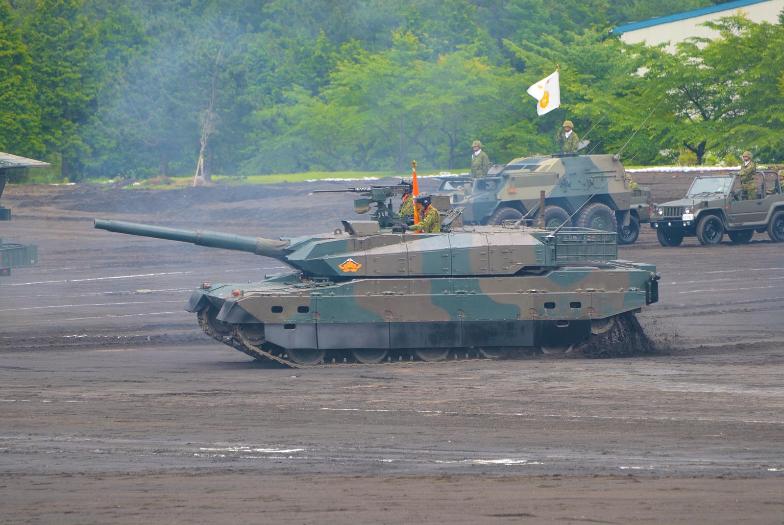 同じくパレード位置に向かう74式前を走っていた90式の煙がモロにw