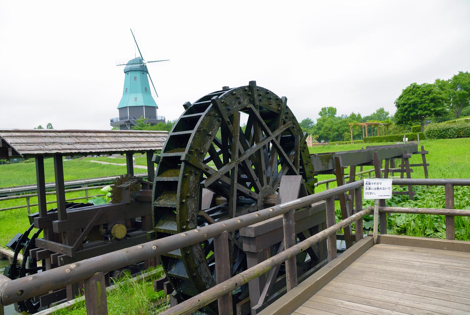 湿地帯付近にある水車と風車、和と洋のマッチングが中々です