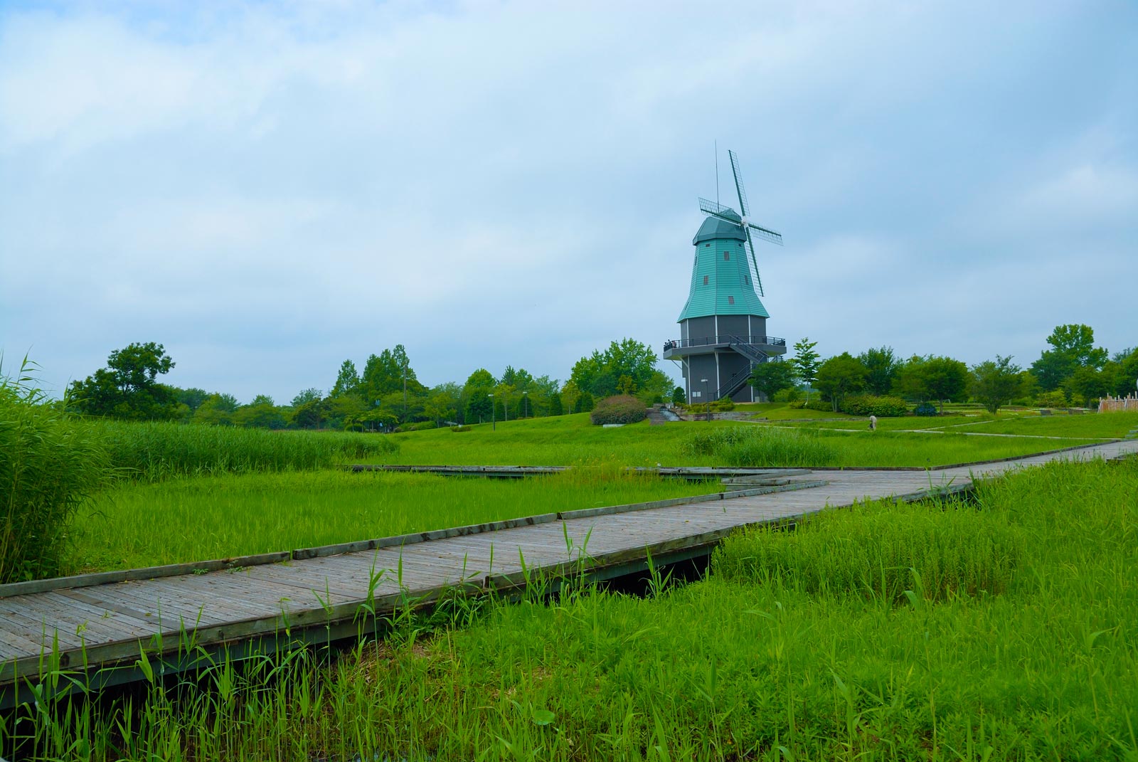 湿地帯付近にある水車と風車、和と洋のマッチングが中々です